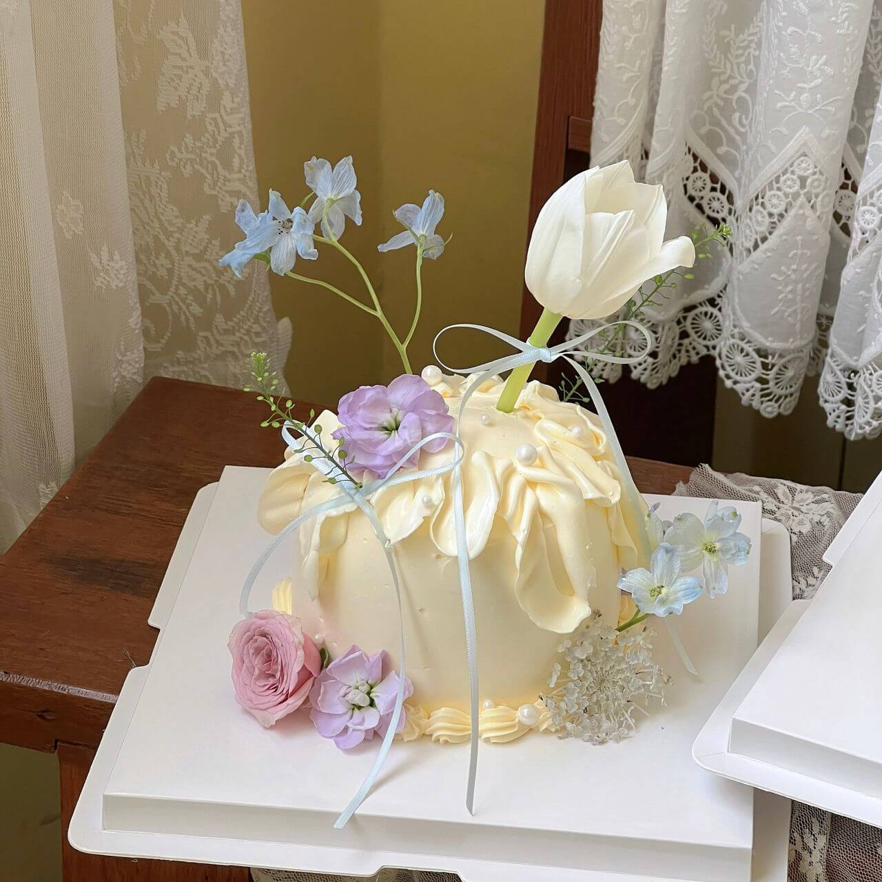 • Cake decoration with non-edible fresh flowers & ribbon.